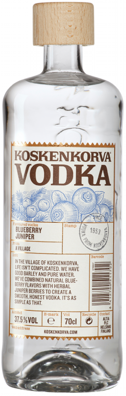 Koskenkorva Vodka Blueberry Juniper е финландска ароматизирана водка, която съчетава вкусовете на диви боровинки и плодове на хвойна – с ясно изразени джиноподобни нюанси.