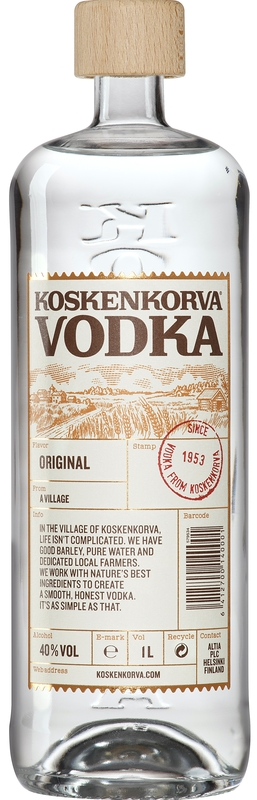 Koskenkorva Vodka Original (1000 ml, 40%) е класическа финландска водка, известна със своята мека текстура, чист вкус и устойчиво производство. Тя е сред най-популярните водки в Скандинавия и се произвежда в село Коскенкорва, Финландия.