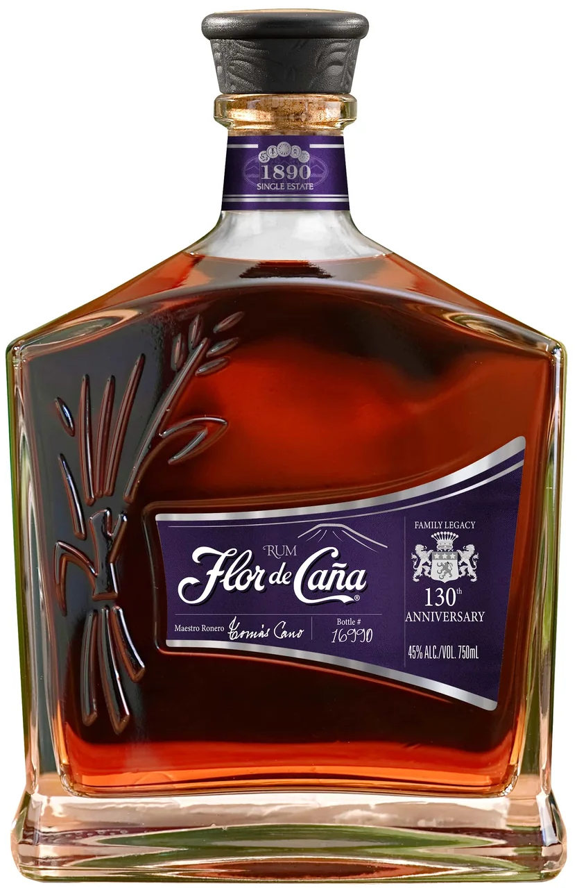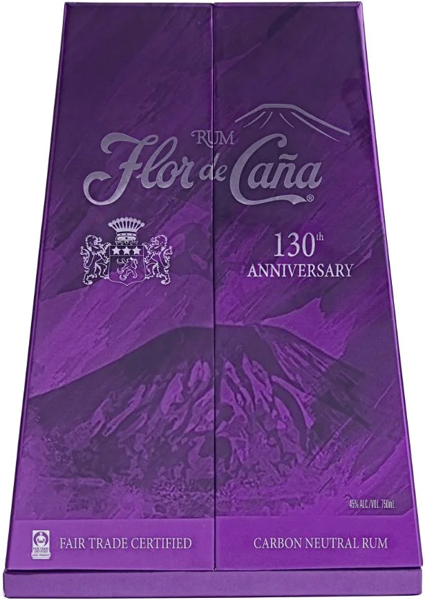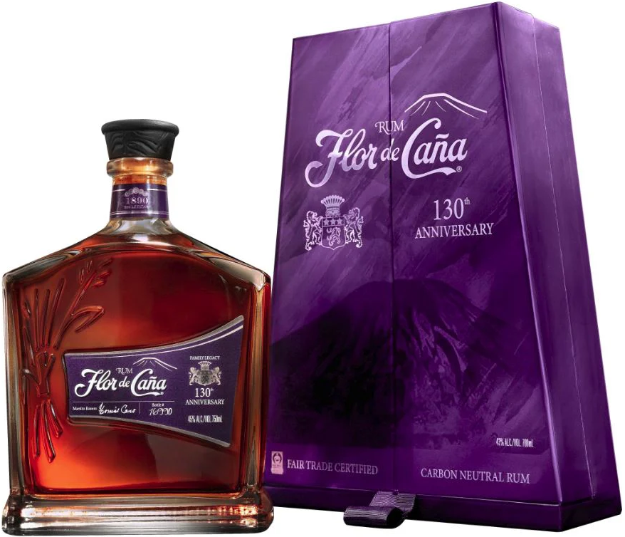 Ромът Flor de Caña 130 Aniversario е впечатляващ ултра премиум ром, блендиран лично от маестро ронеро Томас Кано, за да отбележи 130-та годишнина на дестилерията. Това е една уникална селекция от 20 годишни ромове от семейните резерви, натурално отлежали в малки първокласни бъчви от бърбън, без захар и добавки. Всяка бутилка е индивидуално номерирана върху етикета и подписана от маестро ронеро Томас Кано. Лилавата кутия със сигурност ще се отличи във вашата колекция, не само заради цвета, а и заради формата на вулкан - препратка към местоположението на дестилерията.